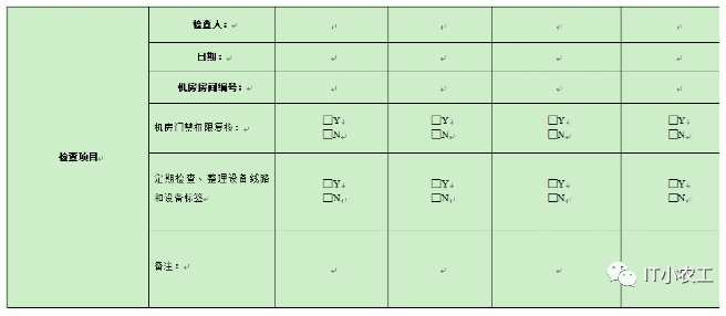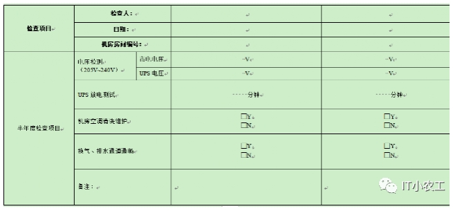 “機房日常巡檢記錄表”、“數(shù)據(jù)中心周巡檢記錄表”、“機房半年度巡檢記錄表” 、“機房年度巡檢記錄表”,由IT部門負責打印、填寫、保管。